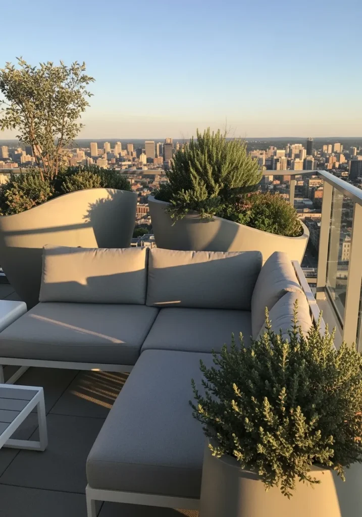 This terrace wraps around a corner with built in seating that maximizes the view. Soft gray cushions and sculptural planters create a polished but relaxed layout. The open skyline in the distance adds depth and makes the terrace feel expansive and grand.