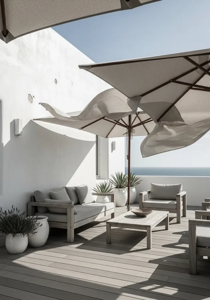 This bright terrace features pale decking, plush seating, and oversized umbrellas that create gentle shade. The white walls reflect natural light beautifully, giving the entire space a fresh and airy look. Clean lines and subtle textures keep the palette cohesive and elegant.
