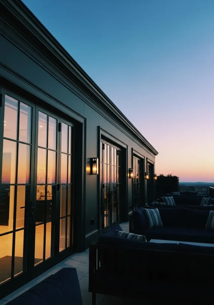This terrace leans into a darker, moodier aesthetic with black framed glass doors reflecting the soft hues of sunset. The seating area is tucked close to the facade, creating an intimate setting that glows as the light fades. The contrast between the dark exterior and warm interior reflections adds depth and drama.