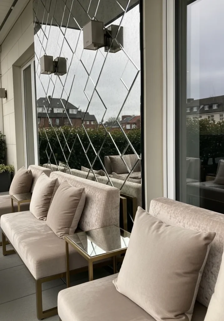 I am always drawn to terraces that feel a little mysterious at night. The reflective glass and subtle lighting make this design feel romantic and refined. It is bold yet cozy, and that combination makes it unforgettable.