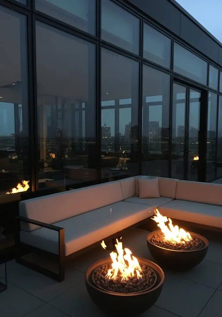 This terrace leans into drama with two glowing fire bowls set in front of a modern glass facade. The L shaped built in seating wraps the corner, creating an intimate lounge area that feels cozy against the dark reflective windows. As night settles in, the flames reflect softly in the glass, adding warmth and movement to the sleek architectural lines.
