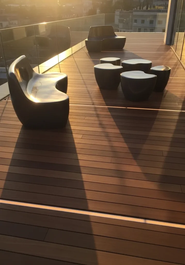 Warm wood decking stretches across this terrace, glowing beautifully in the late afternoon sun. Curved modern chairs and low round tables create a relaxed seating cluster that feels both sculptural and welcoming. The glass railing keeps the view open, while long shadows add depth and texture to the floor.