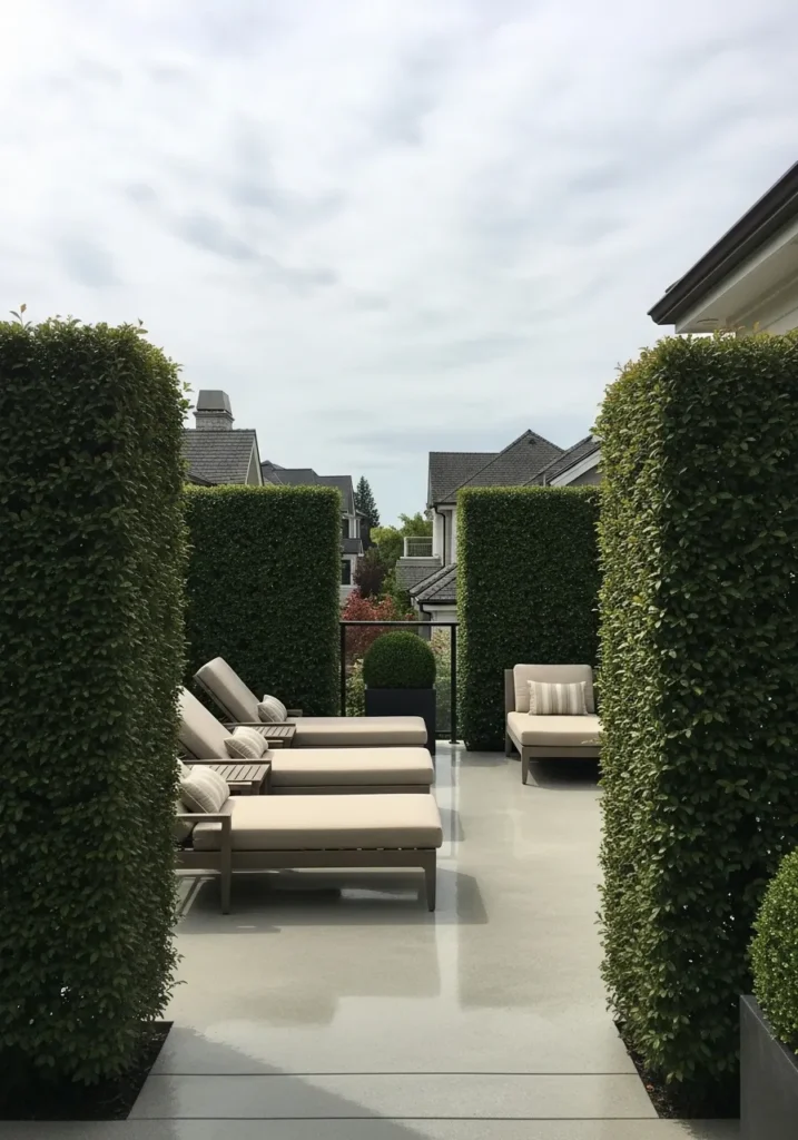 Tall manicured hedges frame this terrace like living walls, creating a secluded outdoor escape. Soft loungers and a simple seating area sit neatly within the greenery, while smooth flooring keeps everything looking crisp and intentional. The structured hedges add symmetry and privacy without making the space feel closed in.