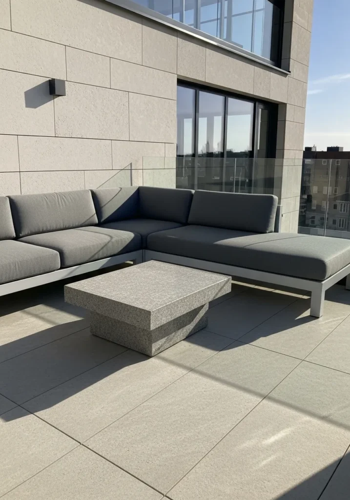 This terrace features a sleek corner sectional paired with a low stone coffee table, all set against clean modern architecture. Neutral cushions soften the structured lines, while subtle wall lighting adds a refined touch. The open city backdrop gives the space an urban elegance that feels current and stylish.