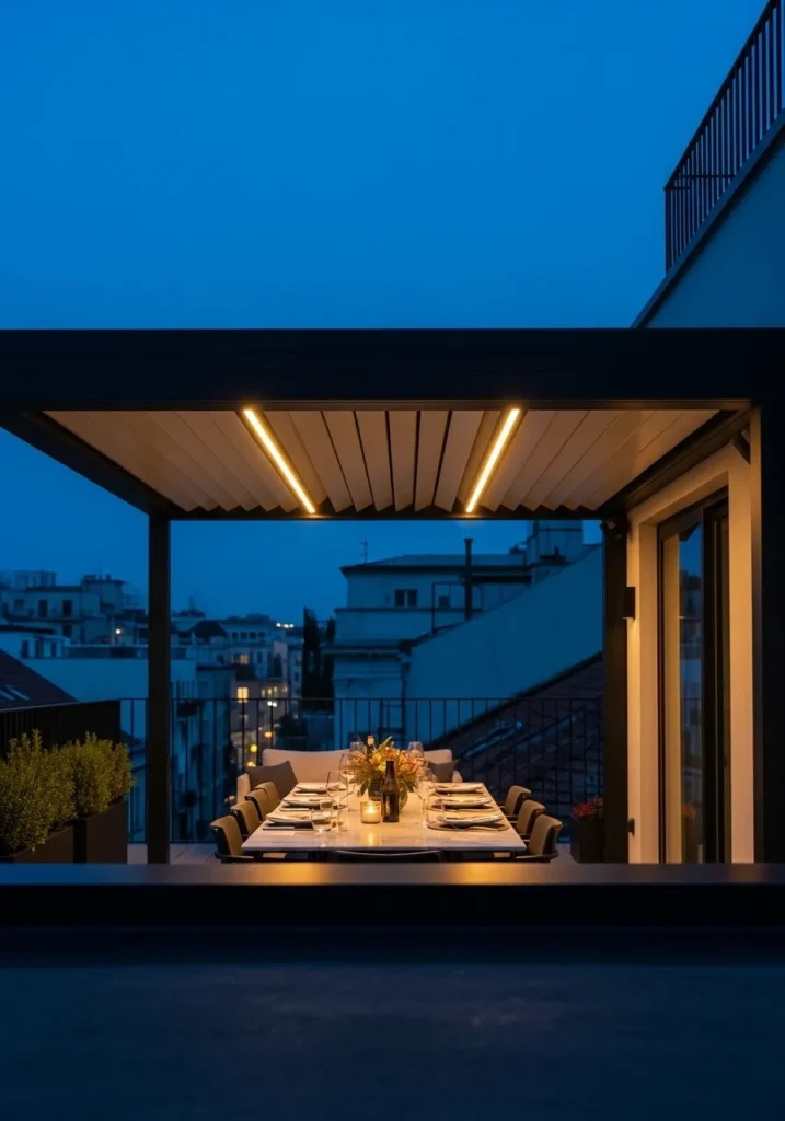 This terrace transforms into an outdoor dining haven under a sleek roof structure with integrated warm lighting. The long dining table becomes the focal point, glowing softly as the evening sky deepens to blue. Clean lines and minimal decor keep the atmosphere intimate and refined.