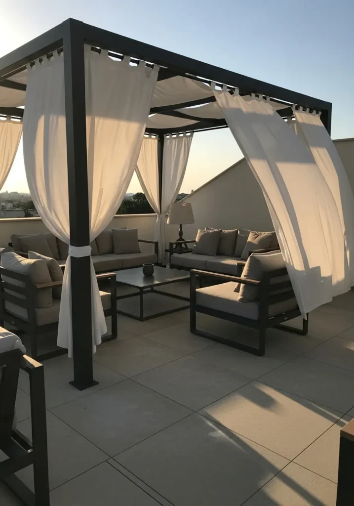 This terrace features a structured black pergola softened by airy white curtains that gently frame the seating area. The modular outdoor sofa in soft beige tones creates an inviting conversation space, while the large format floor tiles keep the look modern and polished. The open sides allow light to pour in, giving the whole setup a relaxed yet upscale vibe.