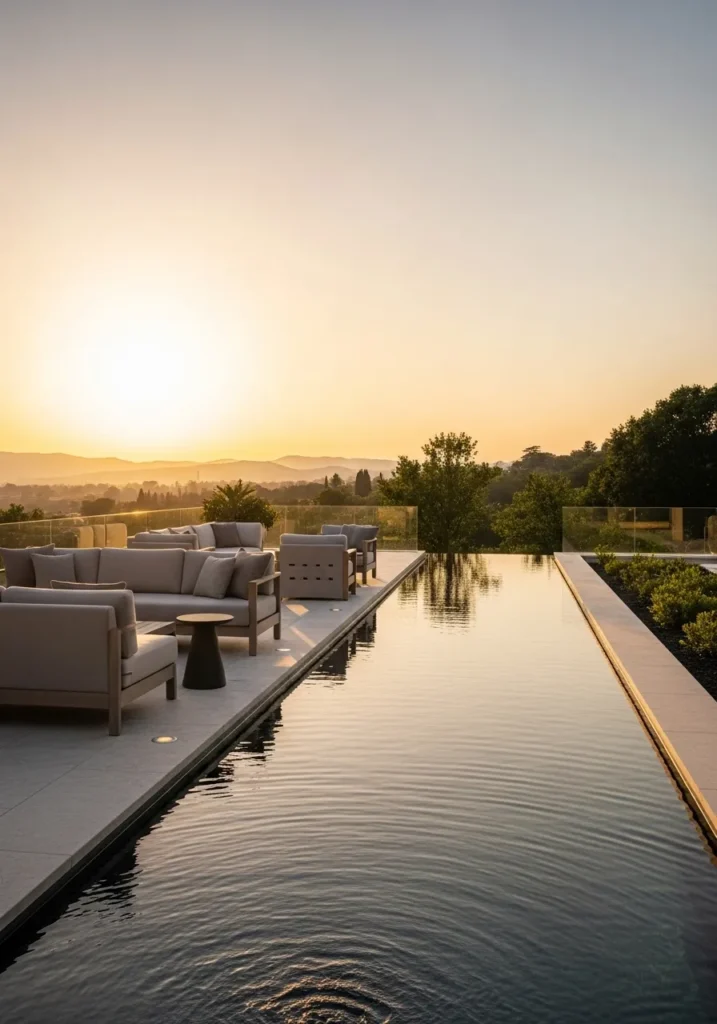 A long reflecting pool stretches along this terrace, mirroring the soft hues of the setting sun. Multiple seating arrangements line the edge, offering plenty of space to relax while taking in the view. The glass railing keeps the horizon uninterrupted, and the warm sky adds a dreamy glow to the entire scene.