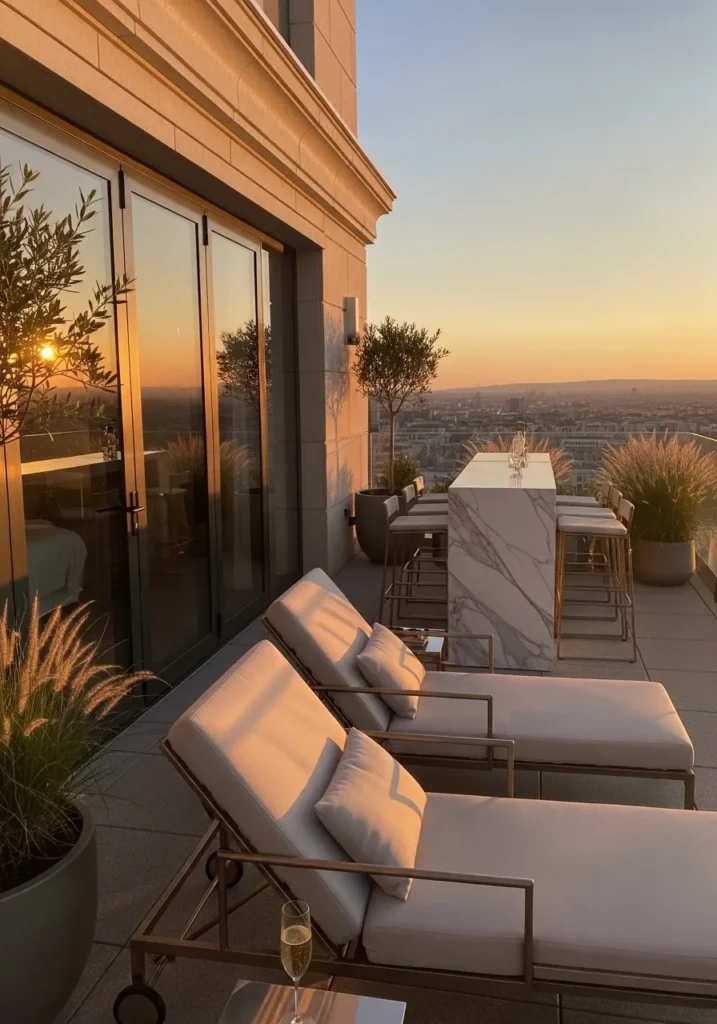 This terrace captures that dreamy sunset glow with sleek loungers positioned to soak in the view. The marble bar adds a layer of elegance, especially with its subtle veining that catches the warm light. Floor to ceiling glass doors reflect the skyline, creating a seamless connection between indoors and out.