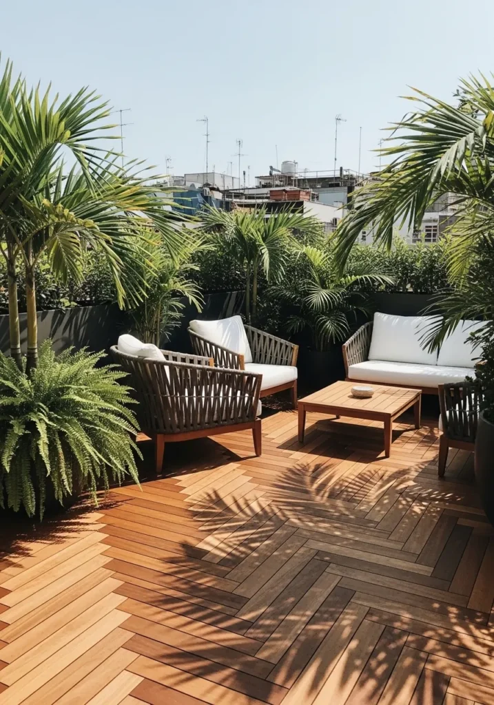 Here, rich wooden decking sets the tone for a lush and layered terrace surrounded by oversized tropical plants. The cozy seating nook with plush cushions contrasts beautifully against the greenery, making the space feel both vibrant and intimate. The mix of textures from wood to fabric to foliage adds depth and warmth.