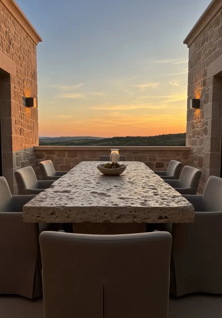 This terrace centers around a substantial stone dining table framed by warm textured walls. The sunset light washes over the space, highlighting the natural tones of the stone and creating a cozy dining atmosphere. The clean lines of the chairs balance the rustic elements, keeping the overall look refined.