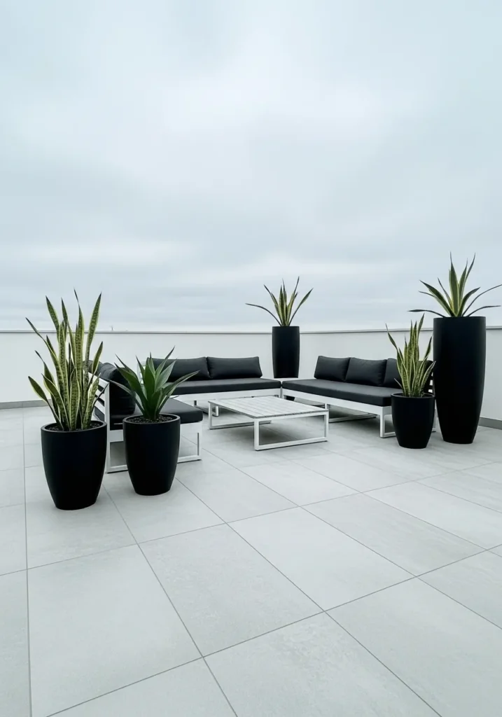 This terrace embraces a monochromatic palette with pale flooring, low profile seating, and sculptural black planters. The overcast sky enhances the soft tones and creates a serene, almost gallery like feel. Clean lines and open space give the design a refined and modern personality.