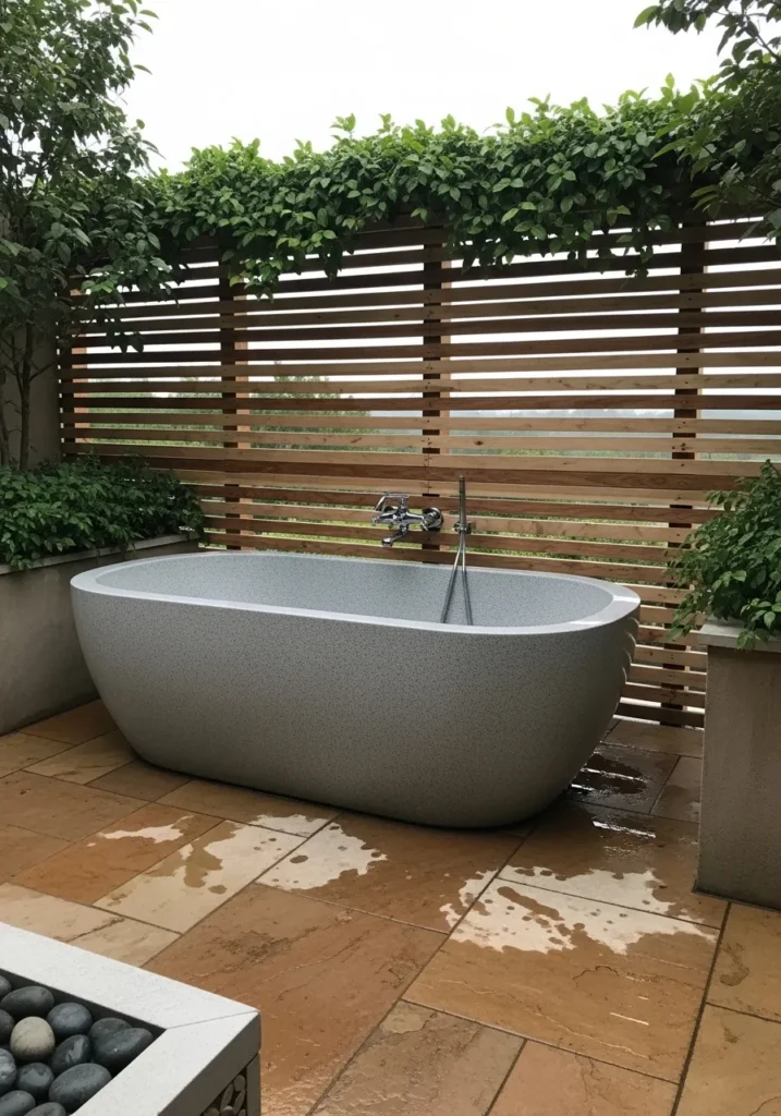 This terrace transforms into a private spa retreat with a freestanding soaking tub set against warm stone tiles and wooden privacy screens. Lush greenery above the slatted wall softens the edges and adds a natural touch. The layout feels intimate and thoughtfully designed for relaxation.