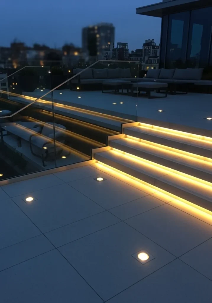 This terrace stands out with sleek steps illuminated by warm recessed lighting that creates a glowing pathway at dusk. The clean tile flooring and subtle glass railings keep the look modern and streamlined. As the city lights begin to twinkle, the terrace transforms into an elegant nighttime retreat.