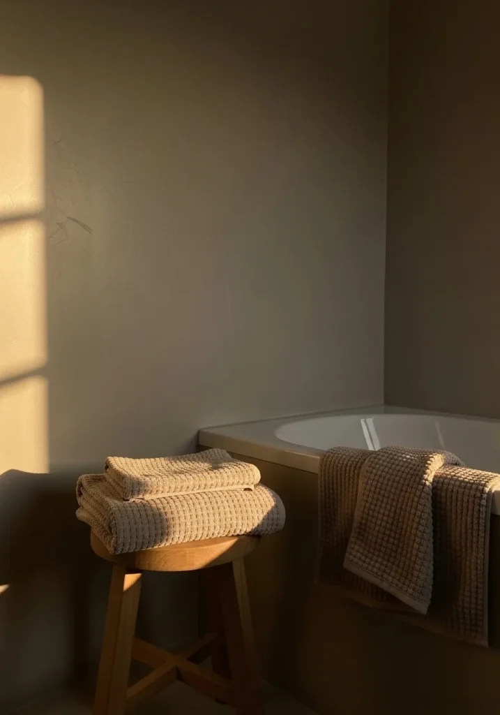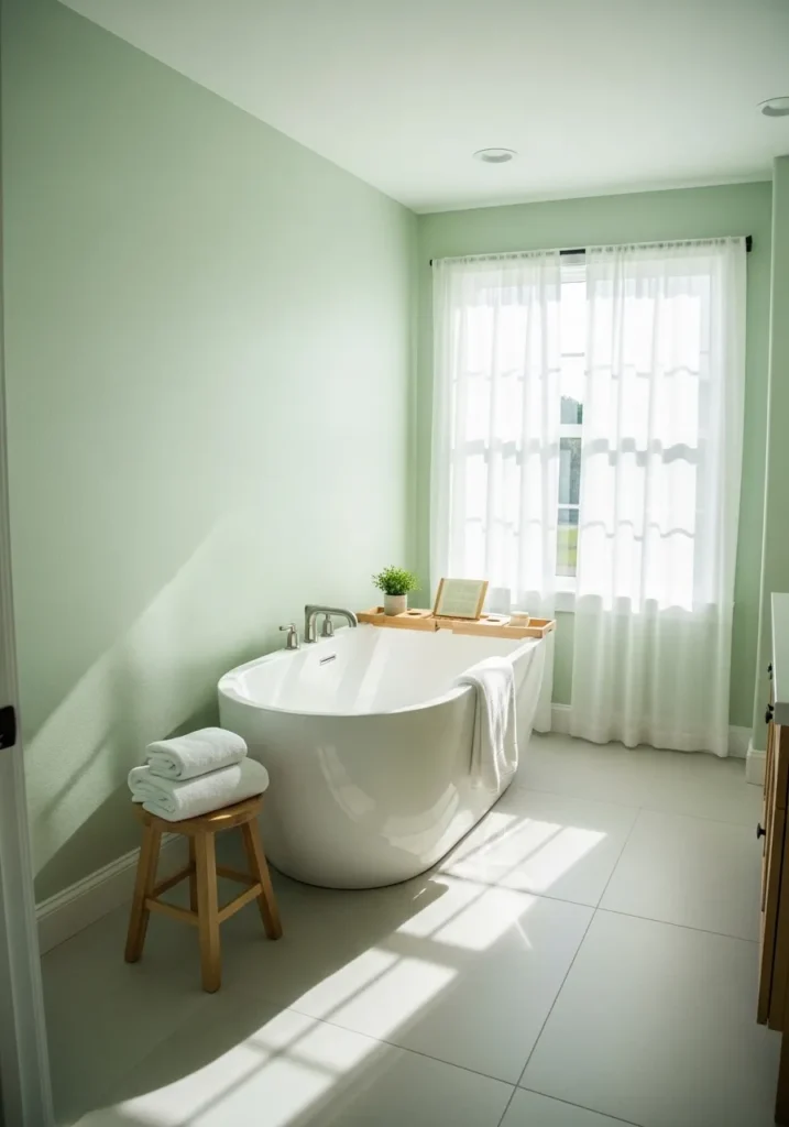There’s a gentle cool undertone here, but it still feels comfortable next to the light wood stool and white tub. It tends to read a little lighter in rooms with good natural light, so it won’t feel heavy. I like it with simple whites and pale wood, and I’d skip anything too dark or glossy since that can make this kind of green feel a bit off.