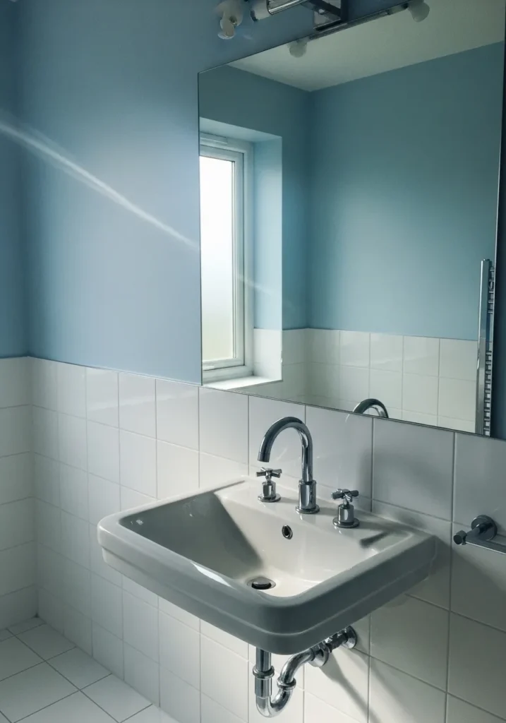 There’s a soft coolness to it, but the slight gray keeps it from feeling sharp. In brighter light it leans a bit more blue, while in softer light it settles into a quieter tone. I like it with crisp white tile and simple chrome fixtures like this, and I’d avoid pairing it with anything too warm or yellow since that can throw it off a bit.
