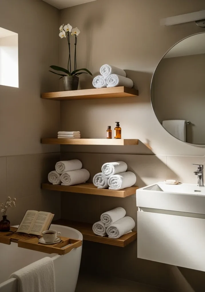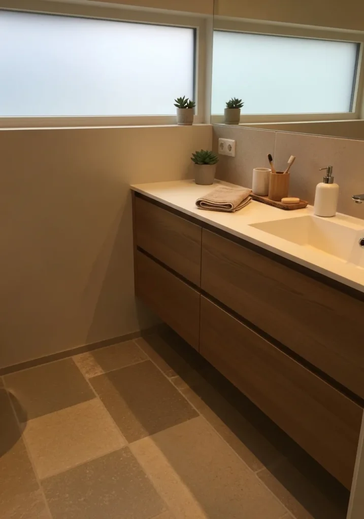 There’s a subtle beige undertone that works really well with wood shelves and white towels, so everything feels tied together without much effort. In brighter light it leans a bit lighter and softer, while in lower light it can look a touch deeper. I tend to like this kind of greige with warm finishes, since pairing it with cooler tones can shift it in a direction that feels slightly dull.