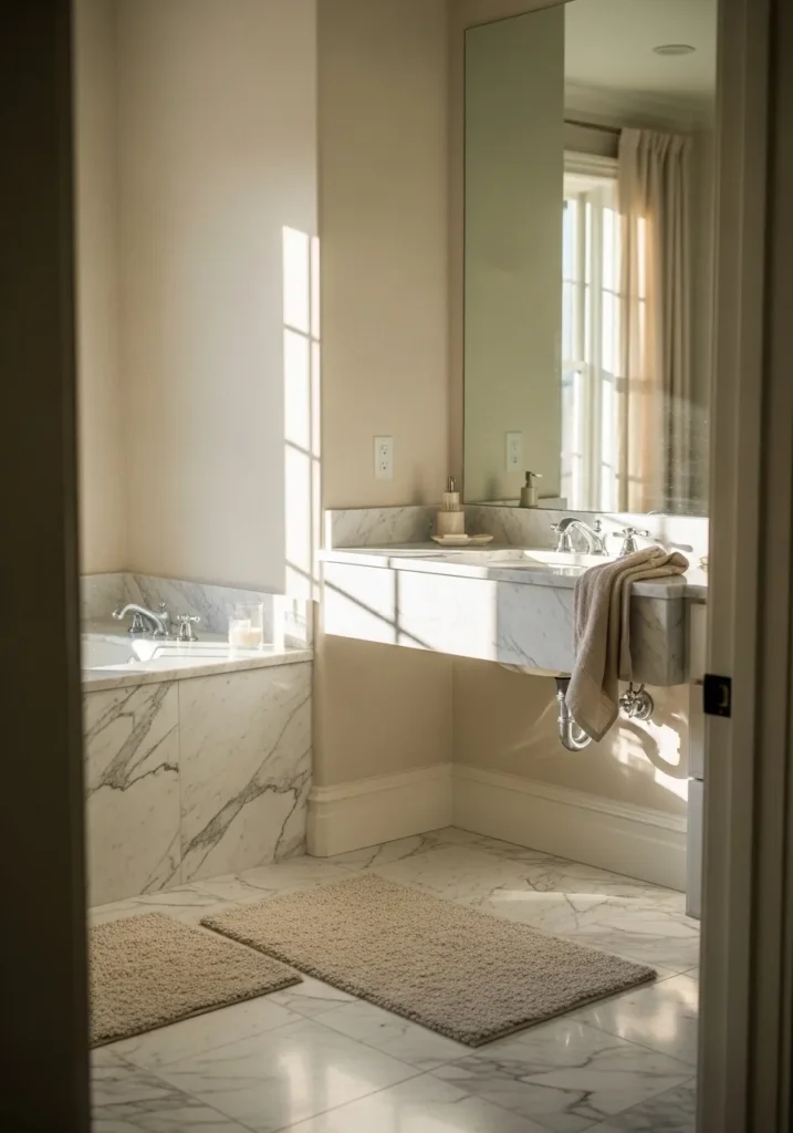 There’s a gentle warmth in it that shows more when paired with white stone and soft textiles. It tends to stay steady in different lighting, though in brighter light it can read a bit lighter and almost off-white. I’d keep finishes simple here, brushed metals or polished chrome both sit well against it.