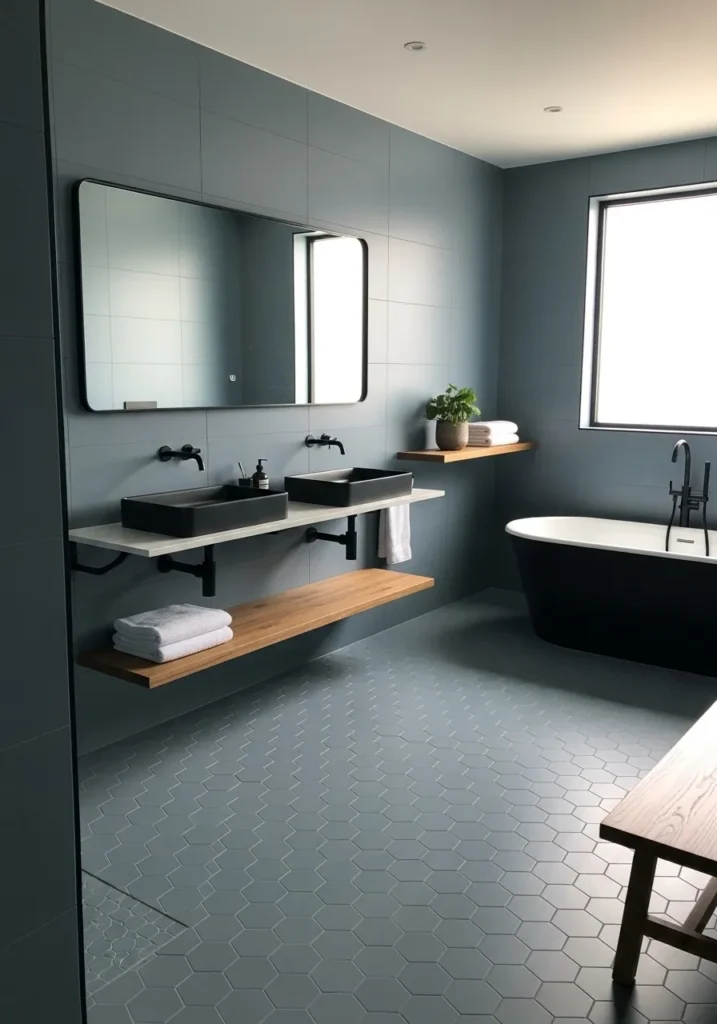 This reads very close to Benjamin Moore Boothbay Gray. It’s a blue gray with a slightly dusty tone, not too bright and not too heavy. On the tiled walls around the sinks, it gives a calm, steady backdrop that feels easy to live with.