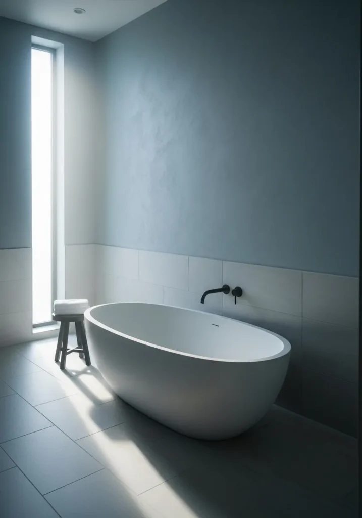 The undertone leans cool with a hint of blue, though it can shift toward gray when the light is lower. Next to the white tub and light tile, it feels balanced and not too dark. I’d keep the rest of the room simple and light, since too many heavy finishes can make this kind of shade feel closed in.