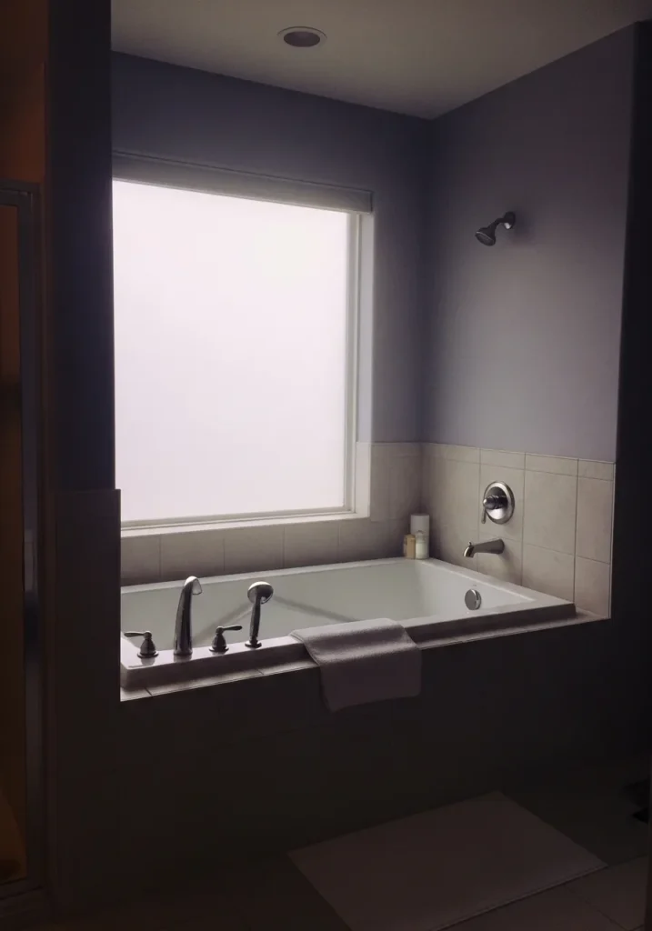 This looks very close to Benjamin Moore Nimbus Gray. It’s a deeper blue gray with a soft, slightly muted finish that doesn’t feel sharp or cold. On the wall around the tub, it reads calm but a bit more grounded than lighter spa colors, which can be nice if you want something with a little weight.