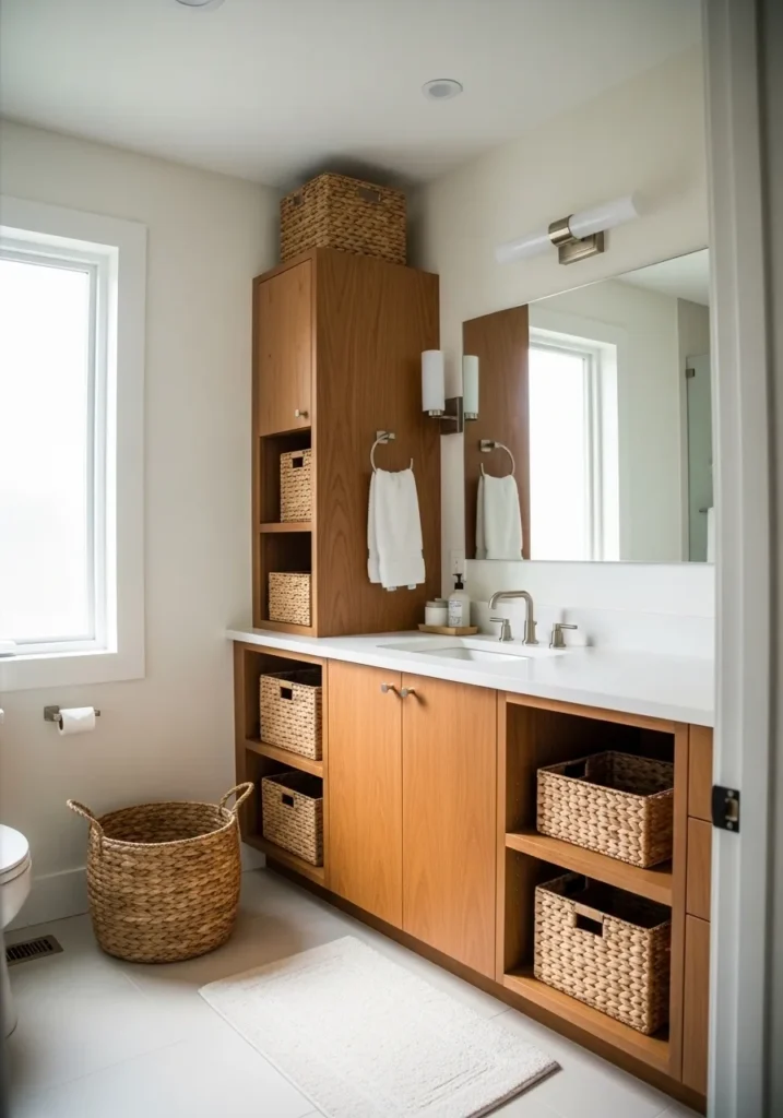 This looks closest to Benjamin Moore Swiss Coffee. It’s a warm off white with a soft creamy base, not stark or cold. On the walls around the vanity, it reads gentle and easy, especially next to the wood cabinetry and woven baskets.