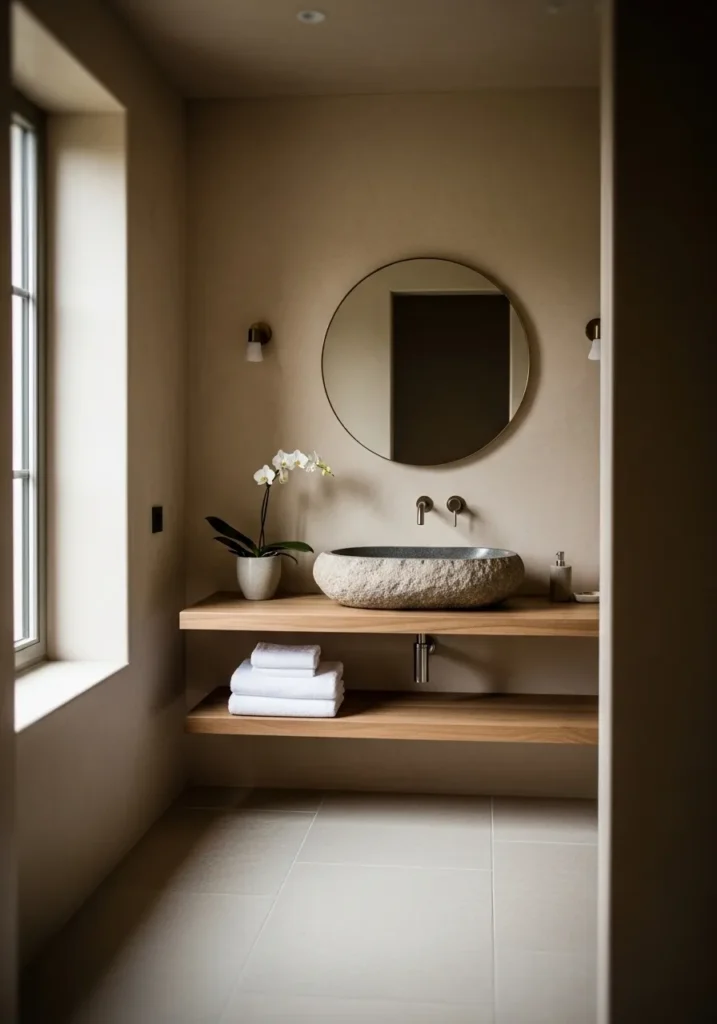 There’s a gentle warmth here that works well with natural wood and stone, which you can see in the sink and shelving. It tends to stay fairly consistent in different lighting, though it can look a bit richer in lower light. I like it with soft whites and simple finishes, and I’d avoid anything too cool next to it since that contrast can make it feel a little off.