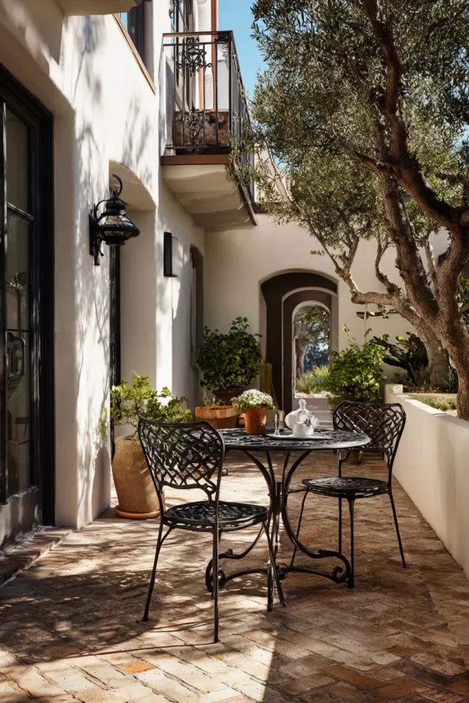 This charming courtyard truly embodies a classic, elegant Mediterranean aesthetic, making you feel instantly welcome. The space features crisp white stucco walls that contrast beautifully with the dark-trimmed windows and doors, leading to a petite balcony with a stunning wrought-iron railing. The floor is paved with old, warm brick in a herringbone pattern, and a beautiful gnarled olive tree provides natural shade. A small, bistro-style wrought-iron table and chairs is perfectly set for a quiet breakfast, emphasizing the intimate scale of this cozy patio.