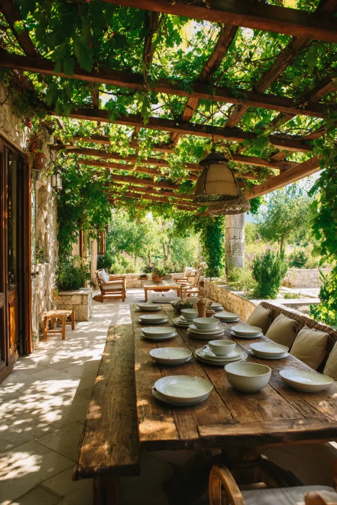 I think this design is just magnificent because it truly celebrates outdoor living and dining in the most beautiful way imaginable. The natural shade from the vines is so dreamy and instantly makes the air feel cooler, while that massive, rugged table is perfect for those long, lazy lunches that last all afternoon. It’s a wonderfully organic and rustic space that truly makes every meal feel like a special, sun-soaked occasion.