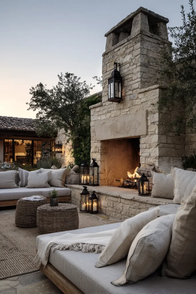 Talk about evening ambiance—this incredible patio is built around a majestic, floor-to-ceiling stone fireplace, making it the ultimate cozy outdoor living room. The fireplace is constructed from light-colored, stacked stone, creating a gorgeous texture that feels incredibly substantial and rustic. Huge, low-slung outdoor sofas are layered with thick, creamy linen cushions and pillows, creating a plush, inviting space to gather. The whole scene is bathed in a warm glow from the crackling fire and several black wrought-iron lanterns placed throughout the space.