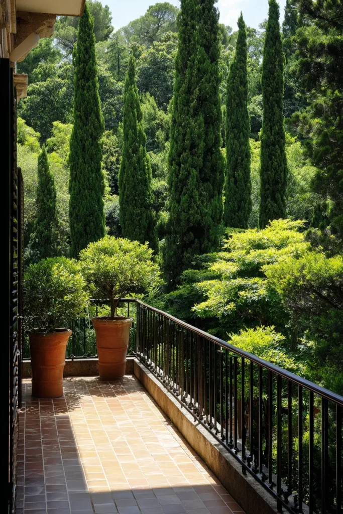 What a spectacular view, this balcony offers a dramatic and very classic Tuscan or Provençal landscape right outside the door! The space itself is simple and elegant, featuring a floor paved in warm, rectangular terracotta tiles that catch the sunlight beautifully. A sleek black wrought-iron railing provides a modern contrast to the old-world charm, but the real stars are the tall, majestic cypress trees that create a stunning, vertical backdrop against the sky. Two large, simple terracotta pots with neatly trimmed greenery finish off the authentic, sun-drenched look.