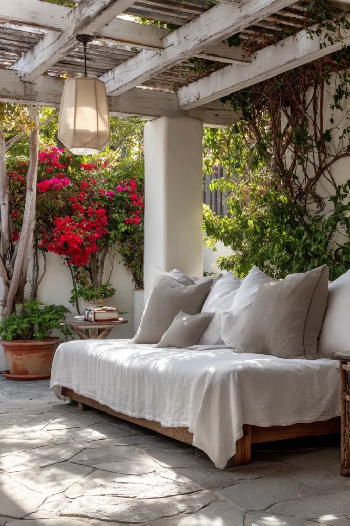This is the ultimate spot for an afternoon siesta, capturing that dreamy, laid-back island life perfectly. The space is defined by a rustic wooden pergola with sun-dappled slats, and a plush daybed piled high with white linen and natural-toned pillows. Vibrant bougainvillea in a gorgeous shock of red and pink provides a spectacular splash of color against the crisp white stucco wall, instantly making the whole area feel alive. The floor is covered in irregular flagstones, adding a wonderful, organic texture that keeps the entire look grounded and relaxed.