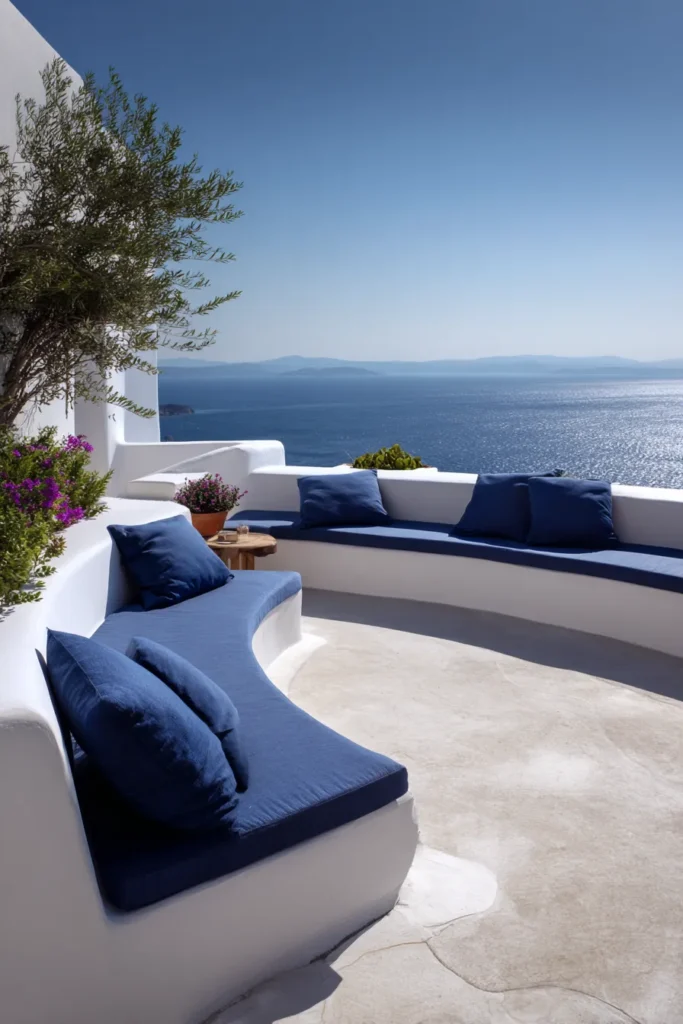 Hello, Santorini! This patio is the quintessential Greek escape, featuring classic white stucco built-in seating that follows a beautiful, gentle curve right along the edge of the terrace. The seating is topped with deep sapphire blue cushions and pillows, creating the most spectacular, iconic contrast against the brilliant white walls and the endless blue of the Aegean Sea in the background. A gnarled olive tree and a pot of purple flowers peek into the scene, adding a perfect, organic touch of shade and life.