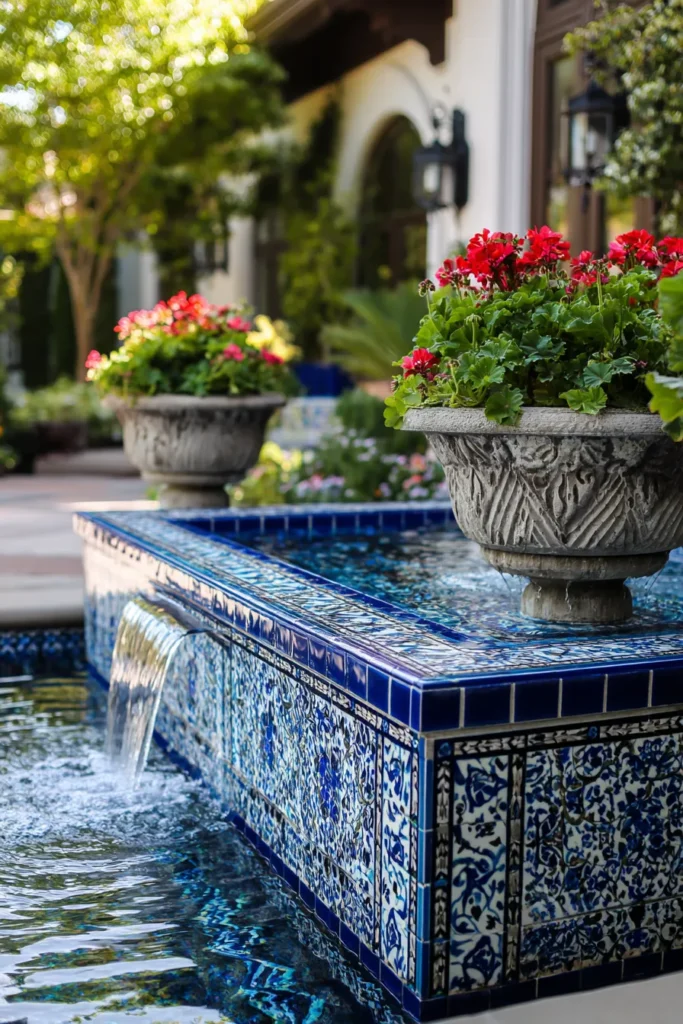 Oh, this detail shot is utterly enchanting and brings such a wonderful sense of cool tranquility and vibrant color to the patio! The star is this stunning water feature, clad in intricate cobalt blue and white patterned tiles that instantly remind you of beautiful Moroccan or Spanish artistry. The sound of the small waterfall spilling over the edge must be so soothing, and the entire look is topped off with classic, carved stone urns overflowing with bright, cheerful red geraniums, creating a gorgeous color contrast.