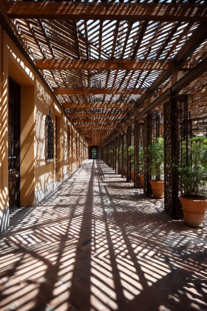 This space is pure architecture magic, creating an unforgettable sensory experience with light and shadow! It features an incredibly long, latticed wooden pergola that extends over a brick-paved walkway, creating the most dramatic, striped shadow pattern as the sun shines through. The wall alongside the path is painted a beautiful, warm sandy ochre, giving off that rich, sun-baked Italian or Spanish villa feel. Simple terracotta pots with fresh greenery line the way, emphasizing the long, majestic perspective.