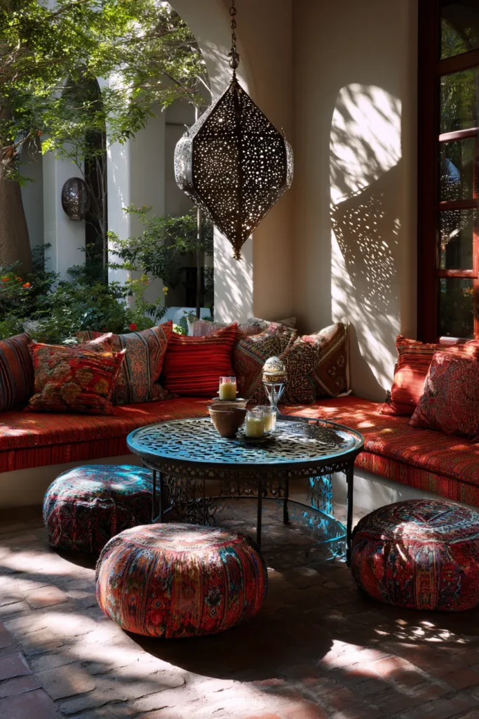I think this space is just utterly magical and inviting—it’s so visually rich and perfectly captures that bohemian, travel-inspired vibe! I love how the natural light filtering through the tree and the lantern creates such a dramatic, cozy atmosphere. It’s a fantastic example of using bright textiles and low seating to turn a simple patio area into a wonderfully layered and sensual outdoor living room—it’s truly a hug in a corner!