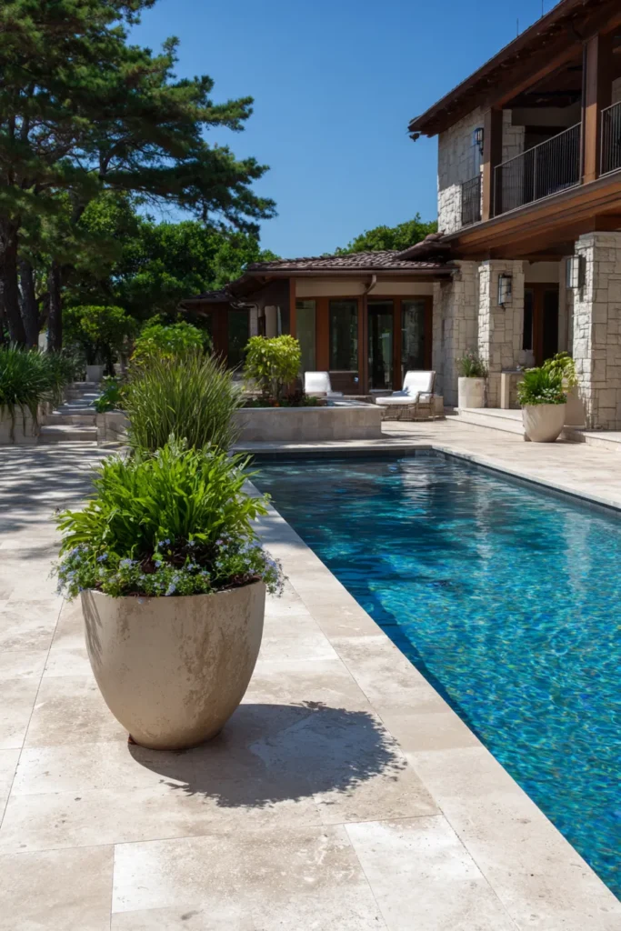Honestly, this just screams five-star resort living, and I am completely here for it. The combination of the beautiful, rugged stone on the house and the clean, bright lines of the patio and pool is just flawless—it feels both grounded in nature and incredibly luxurious. That gorgeous pop of blue from the water is so inviting, and the way the massive planters with lush greenery anchor the space is a beautiful design trick I’m totally stealing.