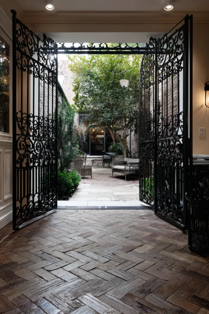 This space feels like the dramatic entryway to a truly hidden oasis, instantly evoking the grand courtyards of historical Spanish or Italian estates. The main feature is a pair of towering, ornate black wrought-iron gates that swing open to reveal a lush, brick-paved courtyard beyond. The floor inside the entryway is paved with rustic herringbone brick, creating a warm transition before meeting the cool, light stone of the courtyard floor. The sheer scale and intricate scrollwork of the gates add so much historical drama and elegance to the entrance.