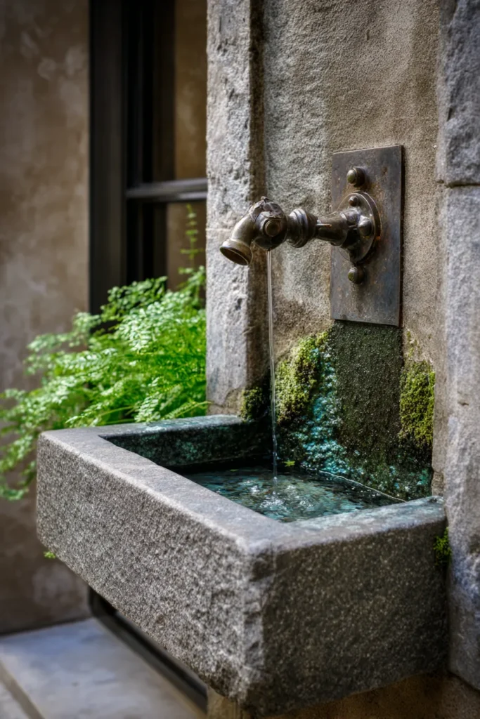 This little water feature is the perfect example of how a small, well-placed detail can add massive amounts of old-world elegance and serenity to a courtyard. The fountain is beautifully simple, featuring a heavy, rough-hewn stone basin attached to a textured wall. A charming, antique-style brass spigot lets out a thin, calming stream of water. What really makes it special is the beautiful, natural moss and teal patina forming on the stone, giving it that wonderfully established, historic feel that you find in hidden European gardens.