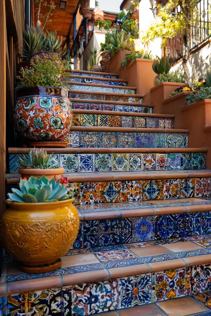 Oh wow, prepare to be amazed, because these stairs are a literal work of art—this is pure Spanish or Talavera tile heaven! Every single riser is covered in a mesmerizing array of vibrant, hand-painted tiles featuring incredible geometric and floral patterns in blues, oranges, greens, and yellows. The warm terracotta risers and the salmon-colored stucco walls create a perfect frame for the riot of color on the stairs. Large, ornate ceramic pots filled with succulents sit on the steps, adding even more artistic flair and texture to the whole beautiful climb.