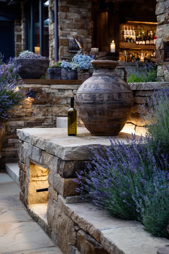 This patio area perfectly captures the sensory richness of the Mediterranean, focusing on a beautifully layered space for evening entertaining. The main feature is the stone-stacked bar or counter area, built from rough-hewn, natural-toned stone, with warm under-lighting that makes it glow after sunset. It’s surrounded by huge clumps of fragrant purple lavender which is the ultimate Mediterranean plant, creating a soft, romantic barrier. An intricate, oversized clay urn sits on the stone counter, adding an authentic, rustic focal point right next to the wine bottles.