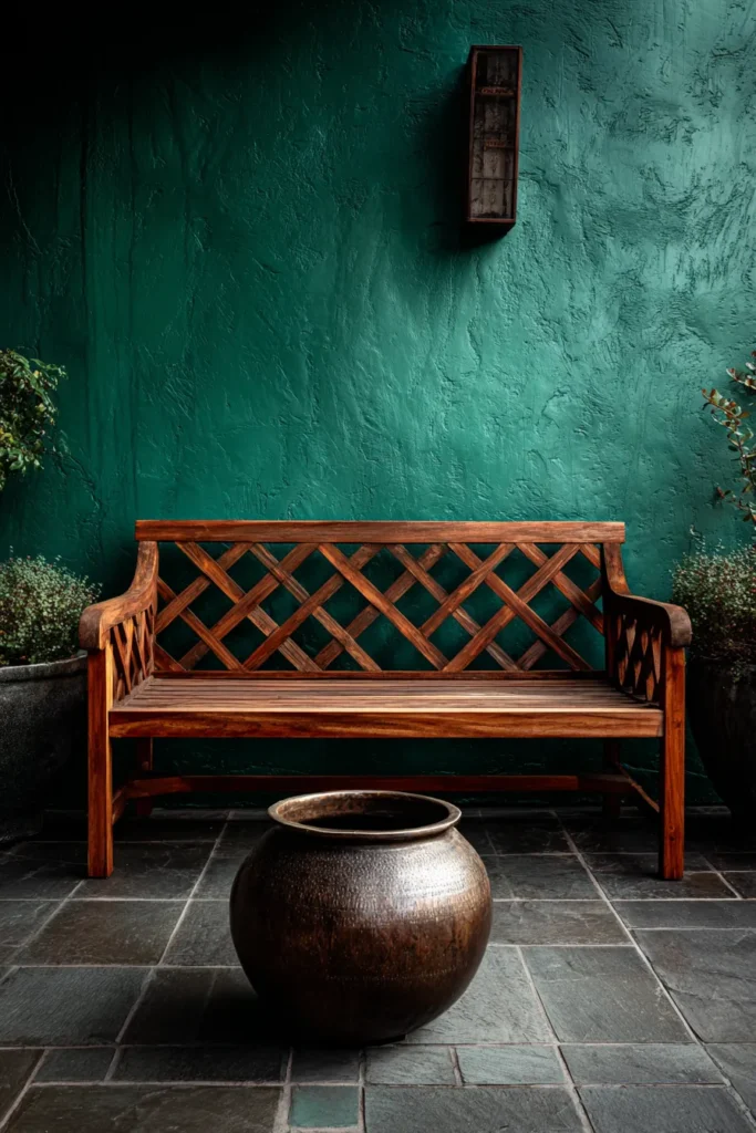This is a beautiful, moody little corner that captures a different side of the Mediterranean feel, focusing on rich texture and contrast rather than bright white stucco. The star of the show is definitely that deep emerald green wall—it has a gorgeous, imperfect plaster texture that feels instantly historic and dramatic. Against that backdrop, the warm, cross-hatch wooden bench just pops, and the dark, rounded metal pot on the dark slate floor completes the grounding, earthy palette. It’s a simple arrangement that relies entirely on rich materials to create a stunning vignette.