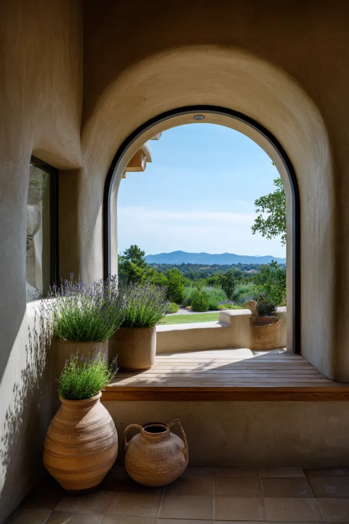 This photo is pure poetry, capturing a cozy transitional space that beautifully frames a stunning Mediterranean landscape view. The key features are the incredibly thick, arched doorway and the warm, sand-colored stucco plaster walls, which give the whole area an authentic, hand-troweled feel. A low wooden sill is perfectly placed within the arch, inviting you to sit and gaze, while large, earthenware pots and vases filled with fragrant lavender complete the perfectly curated, rustic look. The dark trim on the arch creates a crisp, modern frame for the lush greenery and distant mountains.