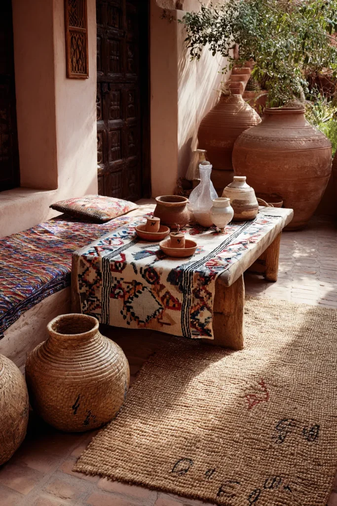 Oh my goodness, this patio is just bursting with personality and warmth, feeling like a cozy corner straight out of a Marrakech riad! It’s all about rich textures and patterns here, with a gorgeous low-slung wooden coffee table draped in a vibrant, patterned kilim rug. The seating is a comfy banquette adorned with colorful textiles and plush cushions, just perfect for lounging. Notice those amazing stacked terracotta pots in the background and the rustic jute rug on the brick floor—every detail adds to this incredibly inviting, layered look.