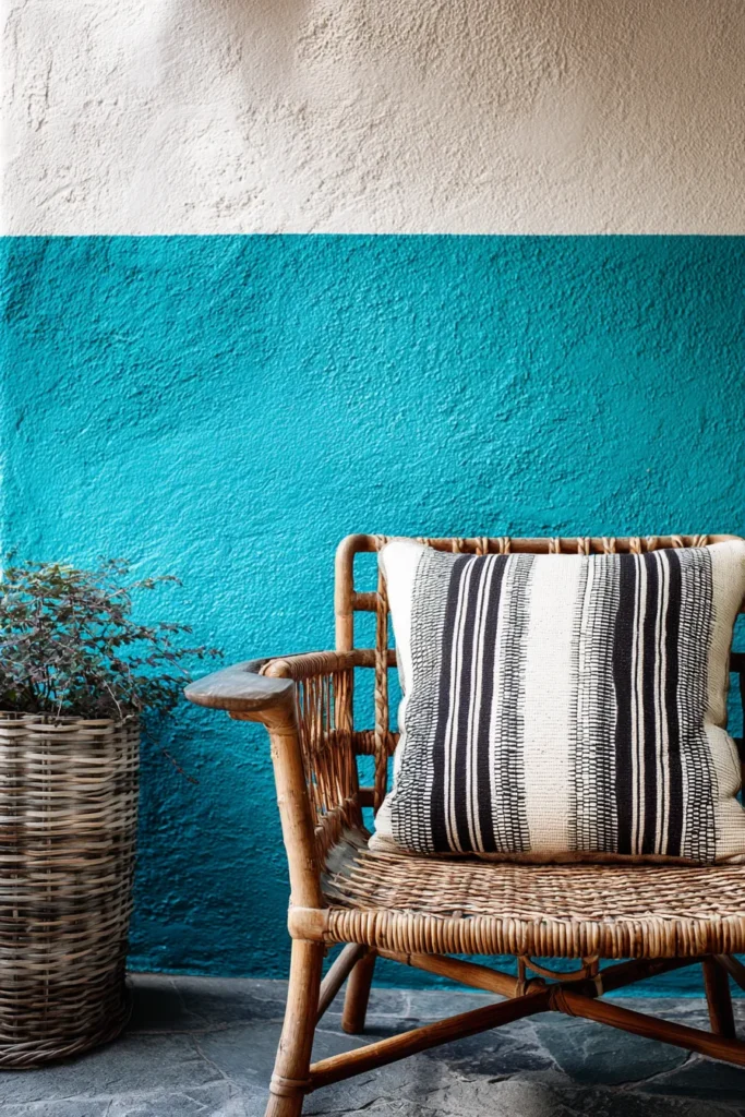 Talk about a pop of color! This design brings a wonderfully bold and cheerful energy with its striking turquoise-teal textured wall, instantly transporting you to a sunny Greek island or a vibrant coastal town. Against this stunning backdrop, a beautiful wicker or rattan chair takes center stage, offering a natural, relaxed counterpoint. The black and white striped cushion adds a touch of modern chic and comfy contrast, making this a truly inviting spot. And that tall, woven planter with greenery just finishes off the look so perfectly.