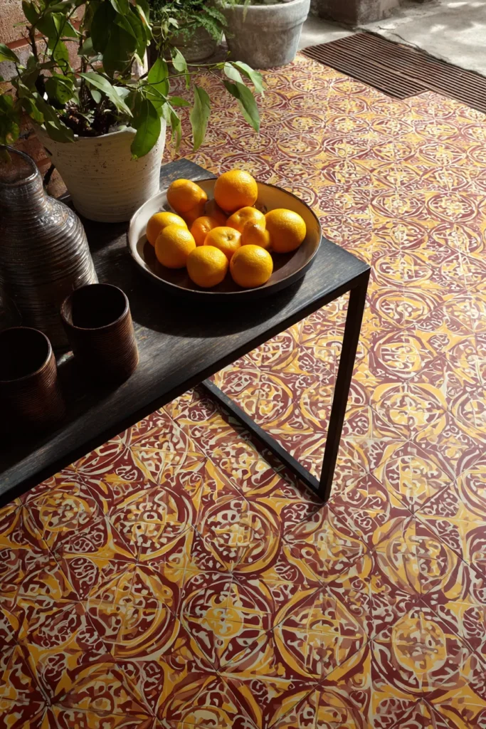 Wow, this patio showcases some seriously stunning floor art with its incredibly vibrant and intricate patterned tiles! The rich, warm ochre yellow and deep reddish-brown hues create a mesmerizing, swirling design that feels so authentically Mediterranean and full of character. Against this lively backdrop, a sleek, dark modern table holds a simple bowl of bright, juicy oranges, which not only looks fresh but really picks up those sunny yellow tones in the tile. And the lush green plant adds a lovely touch of organic life to the space.