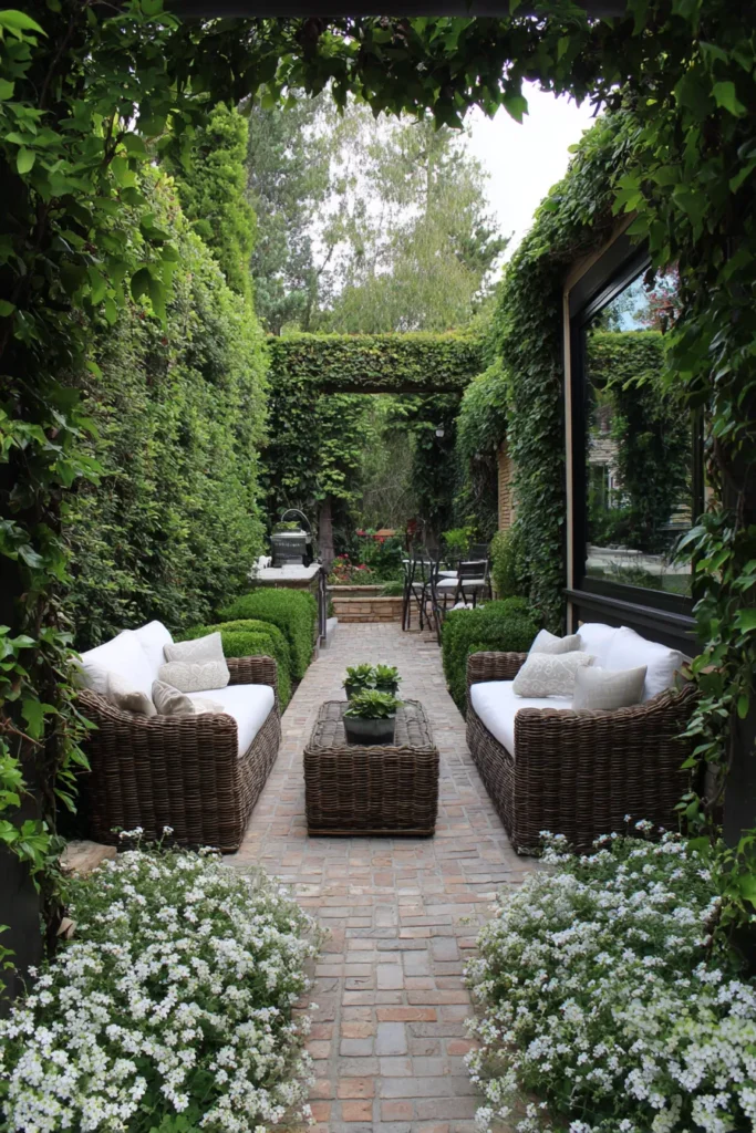 This design feels like a wonderfully secluded, green sanctuary where you can totally escape the world! It creates a beautiful, intimate atmosphere with tall, manicured hedges and climbing ivy forming a lush green tunnel that completely envelops the space. The long, narrow patio path is paved with charming red brick, leading the eye toward the back garden, and the seating area features matching, comfy dark wicker sofas with crisp white cushions, making it feel like a hidden outdoor living room.