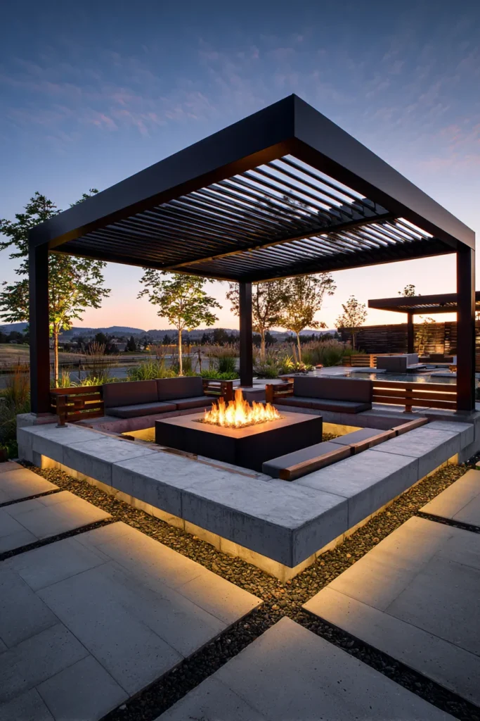 This is a gorgeous modern design featuring a dark, substantial metal pergola with a slatted roof, which is a perfect way to define a cozy outdoor living room. It sits on a chic rooftop or patio space with clean stone pavers and built-in, low-profile seating. The entire area is anchored by a stunning, illuminated stone fire pit, which is the ultimate centerpiece for creating evening ambiance.