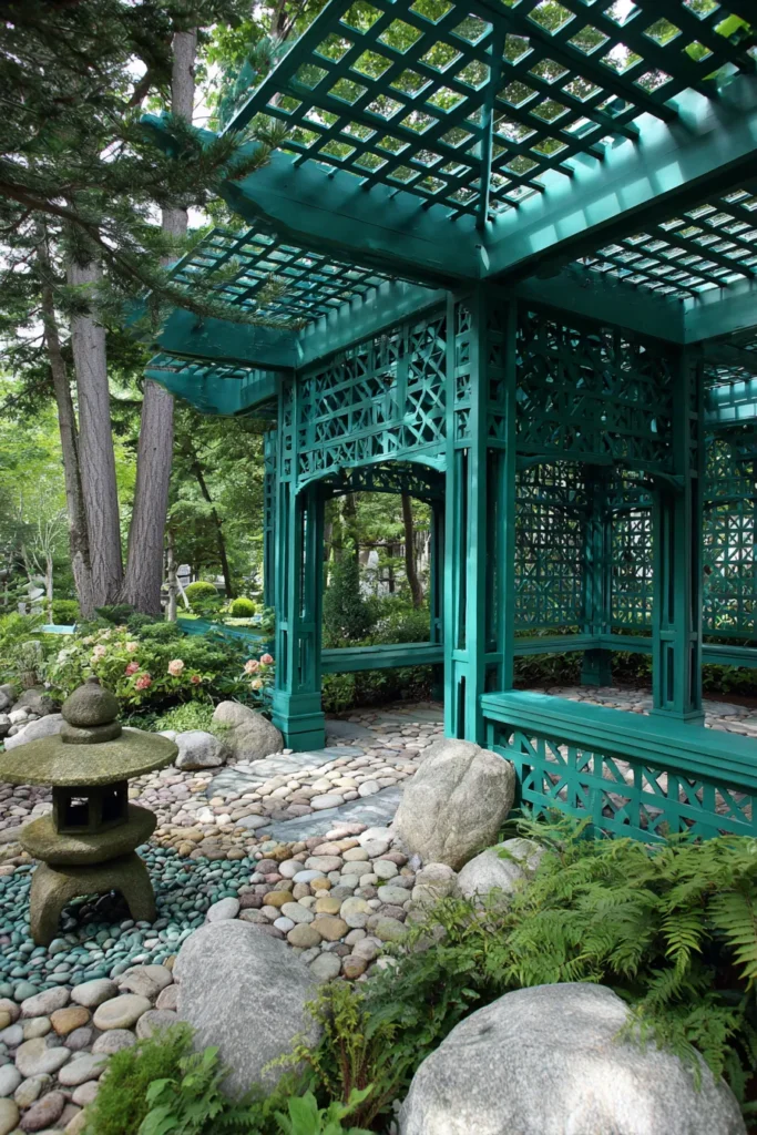 What an unforgettable color! This metal pergola is actually designed as an enclosed gazebo with incredibly intricate, latticed sides and roof, all painted a vivid, deep teal or jade green. It’s set into a tranquil, Japanese-inspired garden full of polished river stones and lush foliage, acting as a stunning focal point and a beautiful sheltered spot for peaceful reflection.