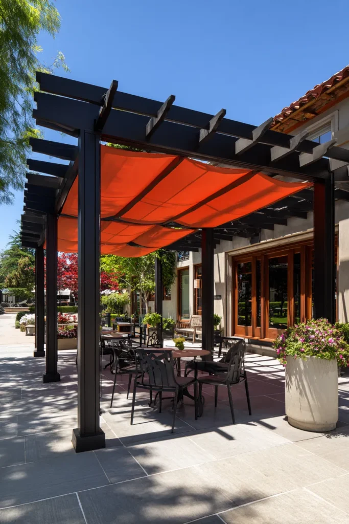 The way this pergola instantly injects a huge dose of fun and energy with that bright orange fabric is just brilliant—it’s such a cheerful, happy color! I love how the fabric gives a complete break from the sun, but you still have the strong, clean lines of the black metal structure. This is such a practical yet incredibly stylish solution for creating a defined, colorful spot for outdoor dining or hosting my next big summer bash.