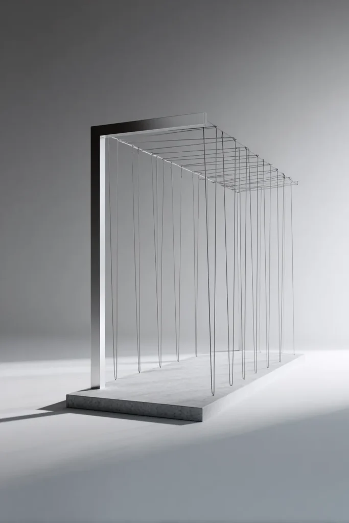This example is a super artistic and conceptual take on a pergola, featuring an ultra-minimalist, white metal frame with long, thin strands of wire or metal cables hanging down to create a transparent, curtain-like effect. It’s more of a sculptural piece or modern divider than a traditional shade structure, all set on a simple, sleek base. It’s pure modern art for the outdoors.